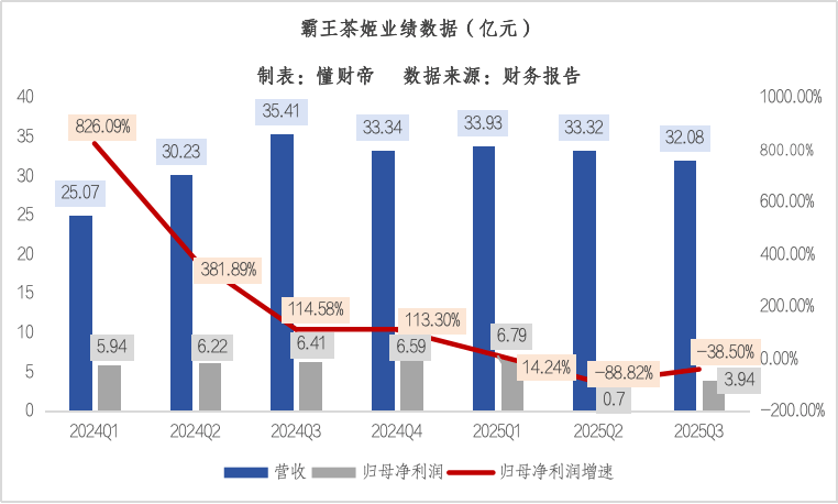2025Q3霸王茶姬继续承压,营收32。08亿元,同比下滑9。4%,归母净利润3。94亿元,大幅下滑38。5%。活跃会员数3520万,同比下滑21。26%。