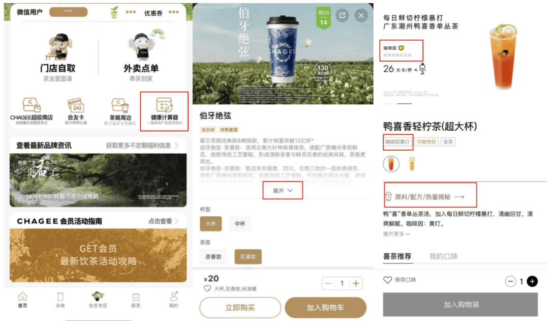 然而,良多消费者并不知情。《中国消费者咖啡因认知及立场查询拜访(2023)》显示,有52。15%的人不清晰茶中含有咖啡因。对此,霸王茶姬曾经做出了改良,上线“轻因专区”,推出了“轻因”版的伯牙绝弦、伯牙鲜沏、花田乌龙等产物,咖啡因含量降低了约50%。它还正在首页推出了“健康计较器”,但设想极其繁琐。笔者点击、跳转了4次,才能看到一杯伯牙绝弦的养分成分消息。别的,正在点单页面,它虽然做了关于咖啡因的“温暖提醒”,但并未较着显露,只要点击“展开”,才能看到。取之对比,喜茶明显做得更好,正在选购页面,所有产物都标注了关于咖啡因的提醒消息。进入点单页面,喜茶间接提醒:咖啡因黄灯,保举薄暮前饮用。
