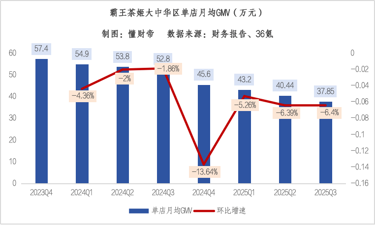 2025Q3,霸王茶姬加盟门店6971家,占比95%。受“外卖大和”+门店极速扩张的影响,大中华区单店月均GMV为37。85万元,同比下滑6。4%,已持续7个季度下滑。取之构成明显对比,古茗单店日均GMV从6200元提拔至7600元,增加22。6%。奈雪单店日发卖额达到7600元,同比增加4。1%。